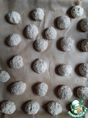 Формируем шарики слегка влажными руками и выкладываем на противень, застеленный пекарской бумагой на небольшом расстоянии друг от друга.