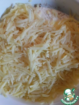 В отдельную посуду натираем очищенную картошку. Сегодня я натирала на крупной терке, но можно и на мелкой, как Вам больше нравится. Картошку тоже немного солим.