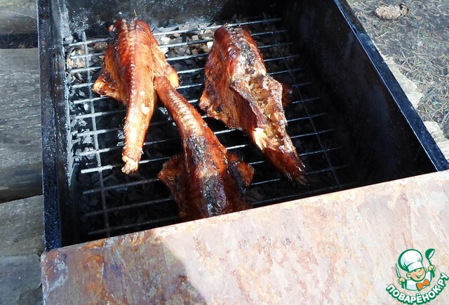 Рыб кладем вертикально на решетку, брюшко расправляем. Смотрел на других сайтах, так делают.