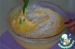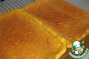 1. Готовим бисквит: отделить белки от желтков. Белки взбить в пышную пену, продолжая взбивать, добавляем сахар. Далее добавить желтки (постепенно), все тщательно смешать. Просеиваем муку и аккуратно перемешиваем