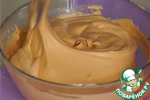 4. Готовим крем: сливки взбить до устойчивых пиков, добавить вареную сгущенку (постепенно) все тщательно взбить