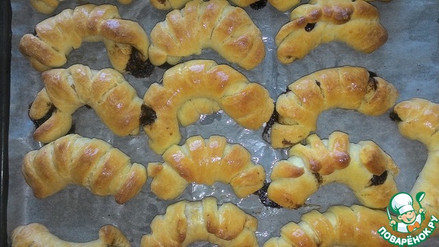 Заворачиваем рогалики и выкладываем их на противень с пергаментом, смазанным растительным маслом.