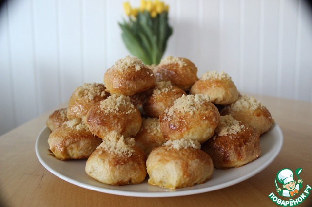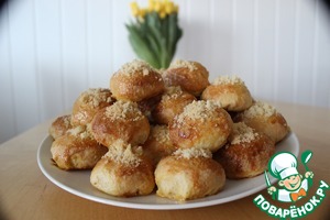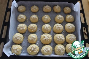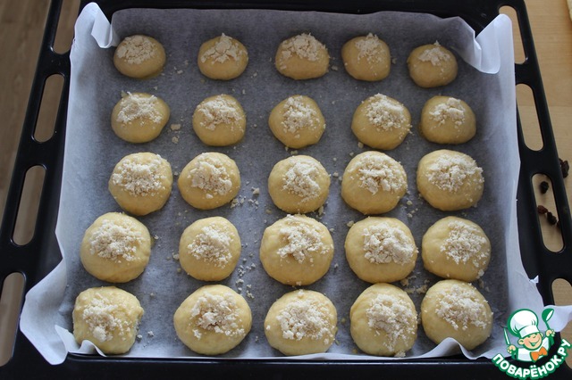 Теперь каждый шарик выкладываем на противень, сверху делаем ямку, смазываем шарик яйцом, и выкладываем посыпку в ямку. Выпекать до готовности (минут 30) при температуре 180 градусов.
