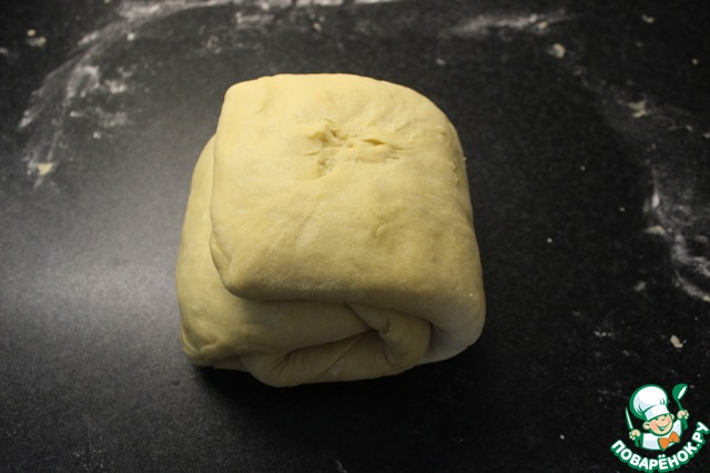 Теперь тесто выложить на доску, накрыть полотенцем, чтобы не высохло и поставить в холод на 30-45 минут. Тесто должно увеличиться в объеме почти в 2 раза. После этого тесто опять раскатать, сложить как в предыдущих шагах и отправить опять в холод на 30-45 минут. И ещё раз раскатать, сложить в холод на 30-45 минут.