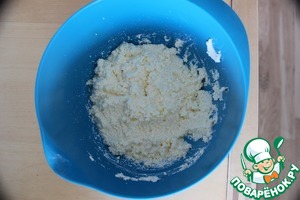 Пока тесто стоит в холоде, приготовить начнку и посыпку. Для начинки смешать творог, 2 желтка, сахар по вкусу и ванилин.