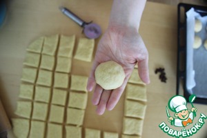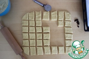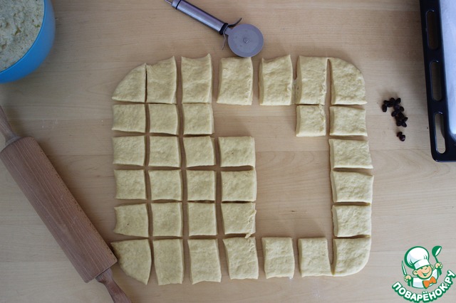 Когда тесто подошло в третий раз, раскатываем его (чуть меньше 1 см толщиной) и делим на квадратики. У меня получилось 42 квадвартика 4х4 см. Можно делать и меньше, тогда работы будет больше, но и колачки будут меньше и смотреться, мне кажется, лучше.