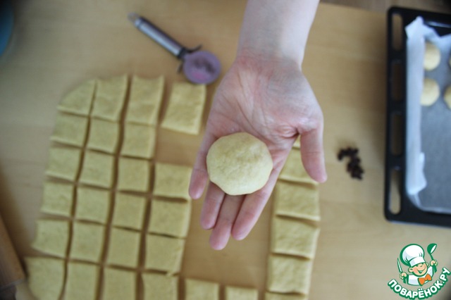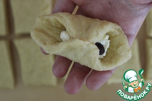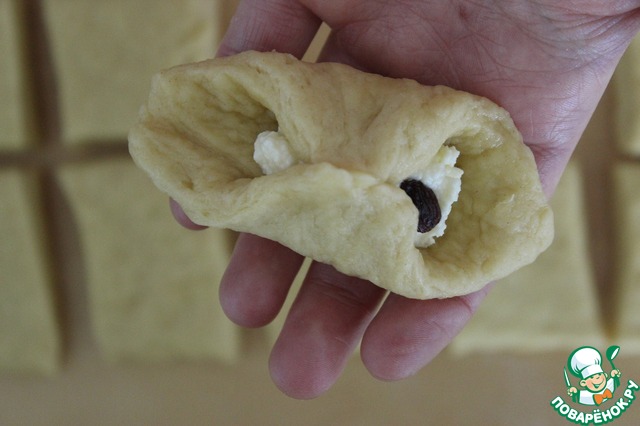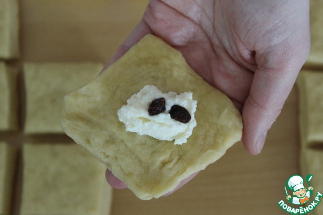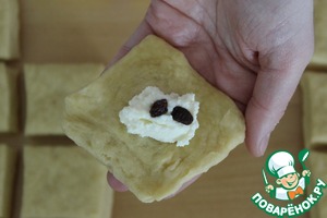 Теперь в центр каждого квадратика выкладываем начинку из творога и одну-две изюминки.