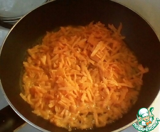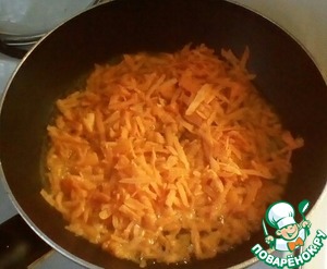 • Вода для риса также закипела, подсаливаем её, опускаем пакетик риса жасмин ТМ "Мистраль" и ставим таймер на 15 минут. И за дело! В закипевшую на сковороде воду добавляем тертую на средней тёрке морковь. Обжариваем, помешивая, на максимальном огне в течение 5 минут.