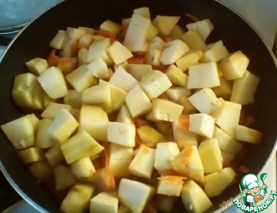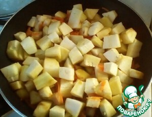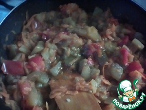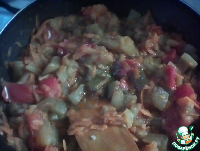 • Далее добавляем баклажан, порезанный кубиками, и жарим, помешивая ещё 5 минут.