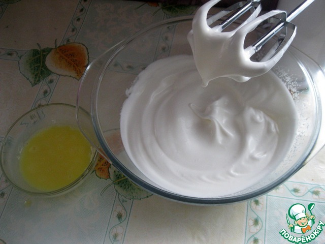 Бисквит первый:Отделить желтки от белков и взбить по отдельности. Ко взбитым до пиков белкам добавить сахар и еще немного взбить.