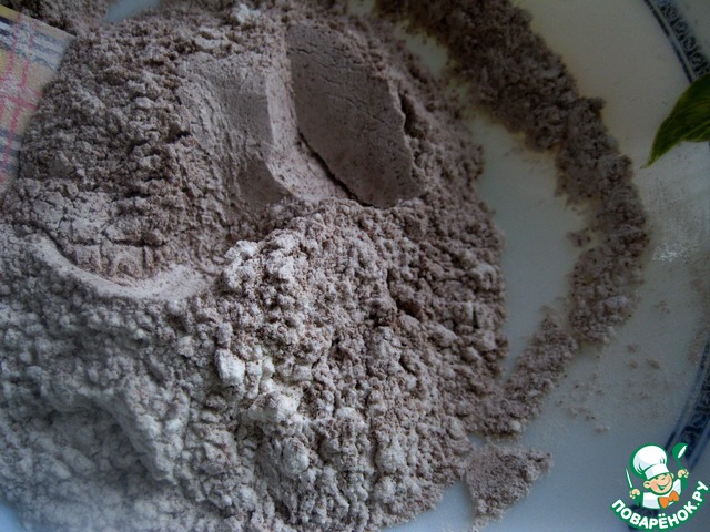 Просеять и смешать муку, крахмал и какао. Добавить желтки, перемешать. Постепенно, порциями вмешать белки.