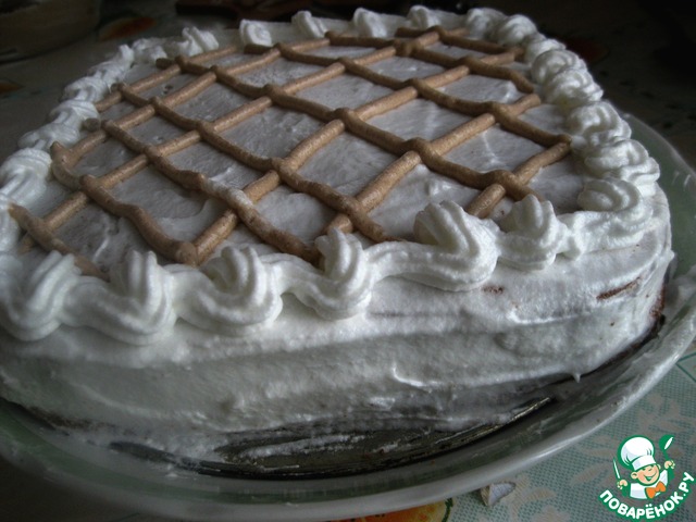 На первый корж выкладываем сметанный крем и накрываем вторым коржом. Белковым кремом оформляем торт. Украсить по желанию. Отправить в холодильник на 3-5 ч. (я оставляла на ночь)