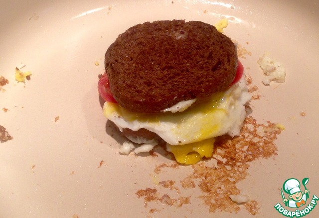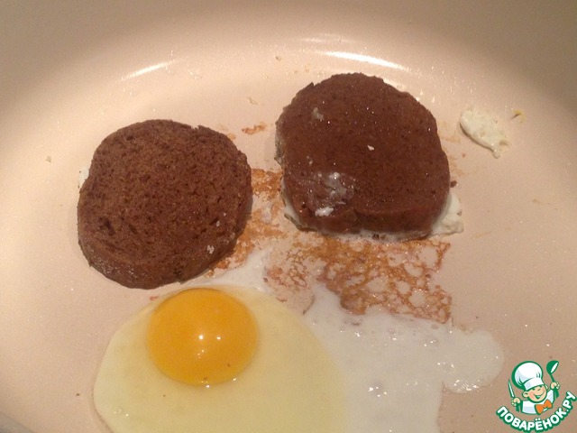 Когда оно чуть-чуть поджарится, перекладываем его на хлеб. Обрезаем края. Накрываем крышкой. Жарим 2-3 минуты