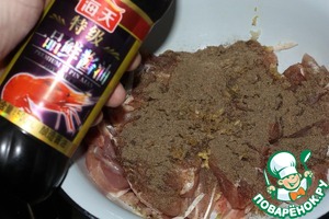Выдавить чеснок, добавить перец, оливковое масло, соевый соус. Кстати, обратите внимание. Одна из лучших, на мой вкус, марок китайского соевого соуса. По вкусу очень напоминает соевый соус Kikkoman.