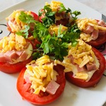 Помидор нарезать тонкими кружочками и выложить на тарелку по кругу. Сверху смазать нашей майонезной заправкой. Выложить ветчину и сверху сыр.