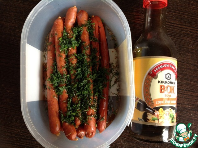 В миске смешать вместе соевый соус и растительное масло. Я использовала соевый соус "Вок" ТМ Киккоман. Колбаски поместить в миску с соусом, посыпать зеленью и тмином. Поперчить по вкусу. Перемешать.