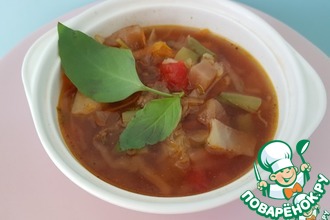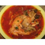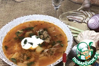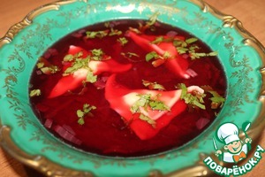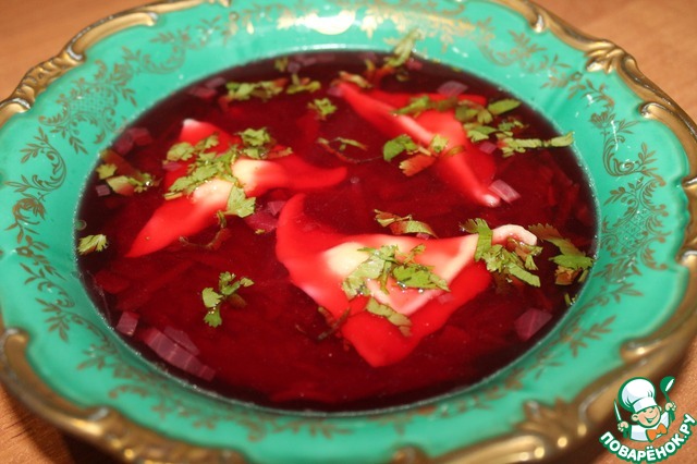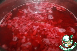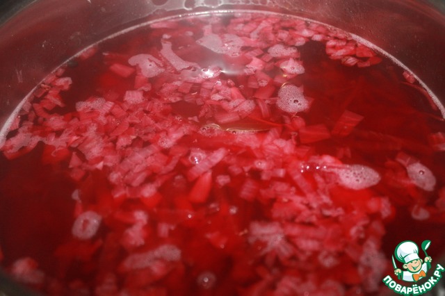 В закипевший куриный бульон кладем специи, соль и сахар, лимонный сок. Свеклу очищаем, трем на крупной терке и добавляем в бульон вместе с половиной обжаренного лука. Пробуем на соль - если порядок, то снимаем с огня и даем настояться.