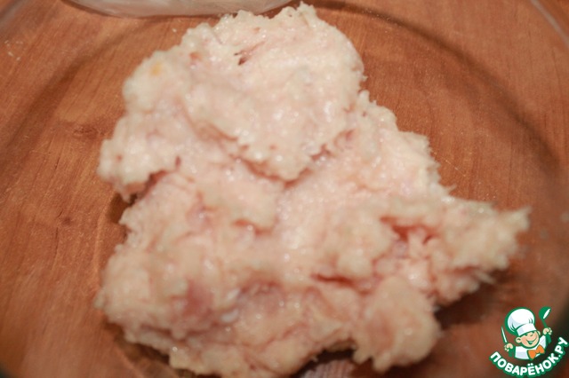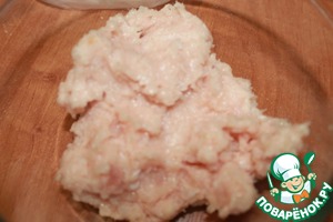 Куриное филе пропустим через мясорубку или измельчим в блендере, посолим. Добавим оставшийся пассерованный лук, перемешаем.