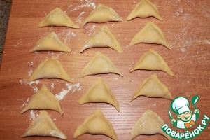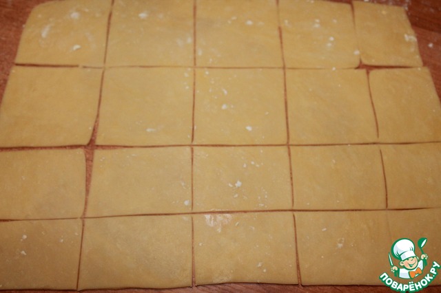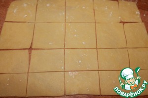 Лепим "ушки". Сначала тесто раскатываем в тонкий пласт и режем на квадраты.