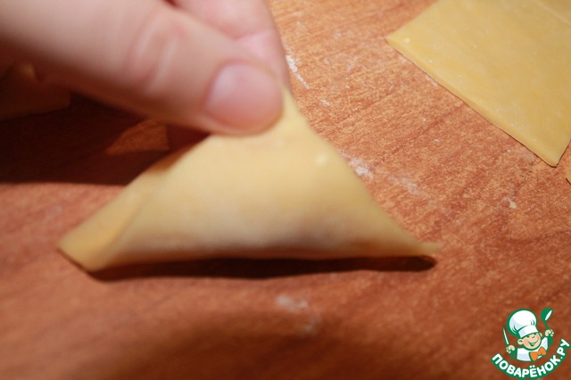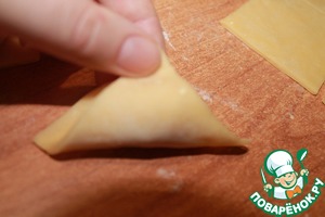 Затем на каждый квадрат кладем немного фарша и сгибаем его по диагонали.