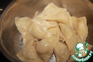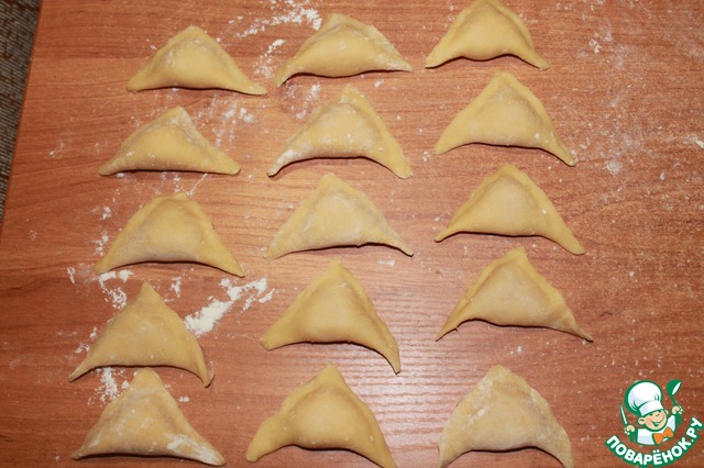 Скрепляем края. Вот такие "ушки" у нас получаются. Из указанного количества муки у меня вышло около 40 штук. Их можно заморозить и отваривать по мере необходимости.