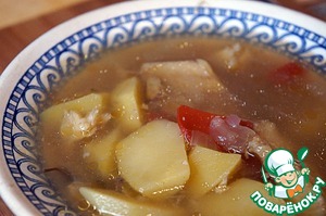 • Бульон довести до кипения, опустить в него картофель и лук, добавить перец, убавить огонь до среднего и варить 15 минут.