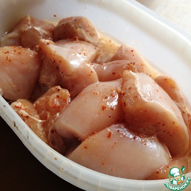 • Филе нарезать крупными кусками и замариновать в смеси острого перца, лимонного сока и 1 ст л растительного масла на 30 минут.