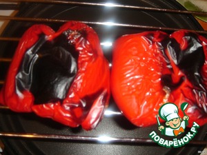 После того, как шкурка достаточно обуглится, поместить перцы в пакет и дать им хорошо пропариться в закрытом пакете.