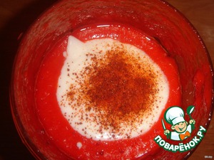 • В пюре из перца добавить сладкую горчицу, йогурт, посолить и поперчить по вкусу, добавить сладкую паприку для усиления вкуса и хорошо перемешать. Получается вкусный и яркий соус. Его необходимо закрыть крышкой и отправить в холодильник.