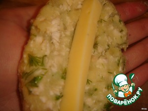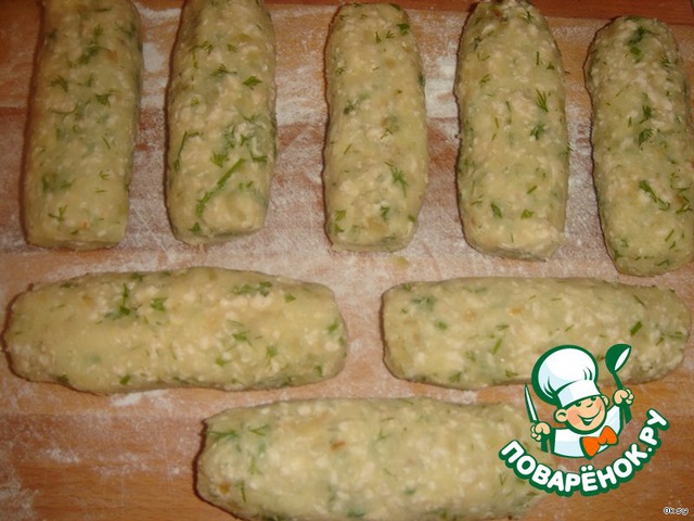 Из полученного фарша сделать крокеты. Кусочек фарша разомните в лепешку на ладони, положите в середину длинный брусочек сыра и сформируйте удлиненную колбаску. Удобнее это делать, если руки присыпать мукой.