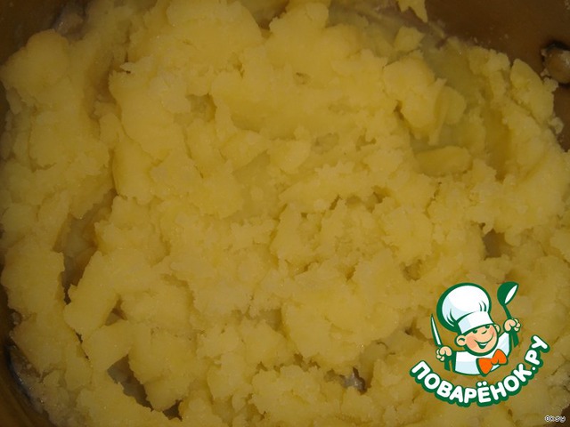 • Картофель необходимо почистить, порезать на куски и отварить в подсоленной воде. Затем слить воду, размять в пюре и остудить.