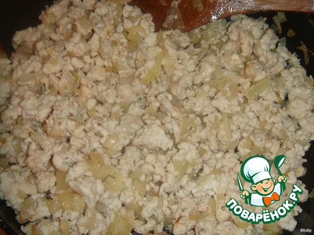 • Грудку измельчить, сделав фарш (или взять уже готовый куриный фарш).