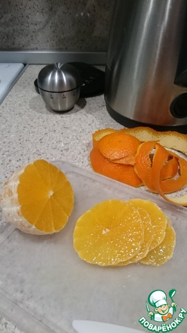 Оставшийся апельсин очищаем от кожуры, нарезаем тонкими ломтиками.