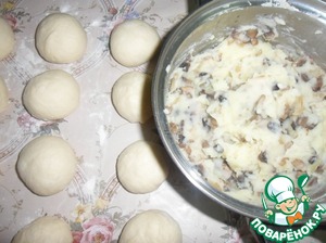 Для начинки я соединила картофельное пюре с жаренными шампиньонами и пассированным луком. Тесто разделила по 50 гр и подкатала каждый кусочек теста в шарик. Оставила для отлежки на 5-7 минут.