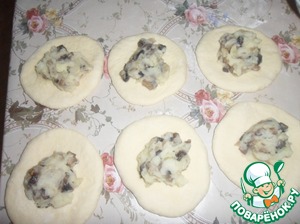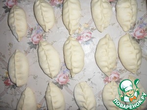 После чего раскатала сочни, на середину каждого сочня выложила начинку - по 30 гр.