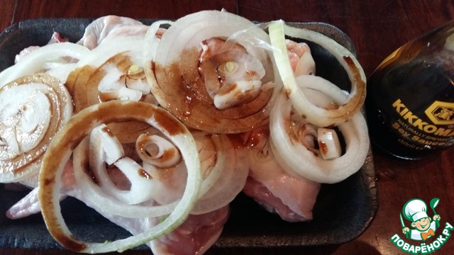 Курицу разделать на порционные кусочки и замариновать в соевом соусе от ТМ "Киккоман".