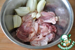 Перекручиваем куриное филе на мясорубке вместе с луком и чесноком. -