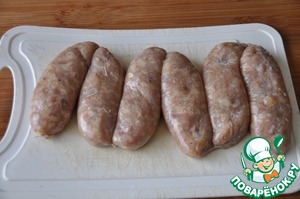 Начиняем кишки фаршем, концы завязываем ниткой. Наполняем не очень плотно. При наполнении колбасок, перекручиваем их через каждый 10-12 см. -