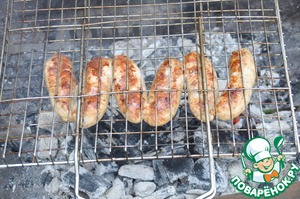 На пикнике запекаем колбаски на решётке на углях до румяности с обеих сторон. Общее время около 15 минут.
