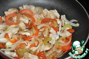 Когда куриная грудка побелеет, кладём сразу все овощи, и обжариваем, помешивая, на среднем огне, около 5 минут.