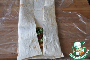 Непосредственно на пикнике берём лаваш, у нас сейчас продают специальные роллы для завертонов, они длинные, поэтому перерезала его пополам. С краю посередине кладём половину количества овощей с куриным филе.