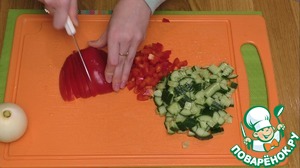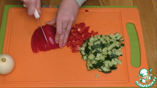 2. Перец и огурец хорошо промойте и тоже порежьте небольшими кубиками.