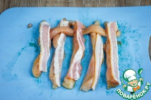 Выложить на доску пять или более слайсов курицы параллельно. Сверху на каждый ломтик положить бекон, нарезанный такой же длины. Затем другим слайсом курицы продеть через один параллельные слайсы.