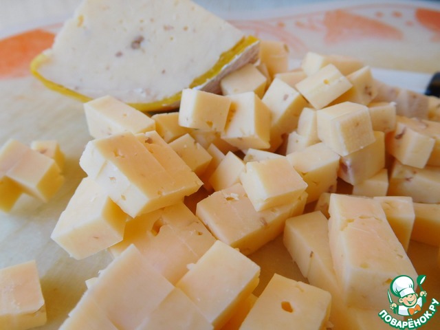 Нарезаем сыр мелким кубиком. Сыр можно брать любой, у меня был с грецкими орехами, что дало дополнительный вкус и аромат салату. Вы же можете добавить измельченную горсть орехов, если у вас обычный сыр.