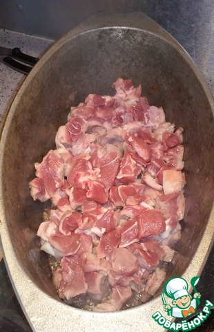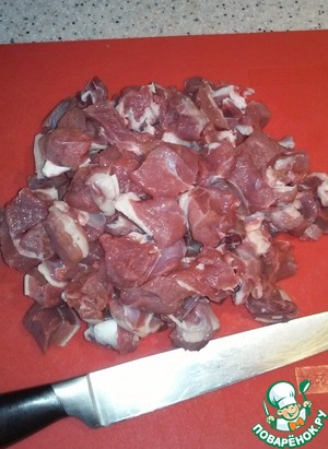 Нарезаем баранину, размер кусочков как на гуляш, примерно с грецкий орех.
