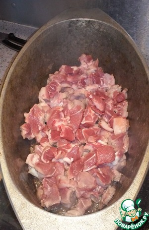 Берем емкость, в которой будем готовить наш плов. Наливаем в него растительное масло, нагреваем и выкладываем нарезанное мясо. Мясо должно хорошо схватиться с одной стороны, поэтому не начинайте его сразу перемешивать.