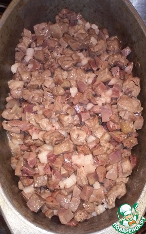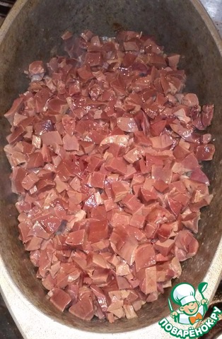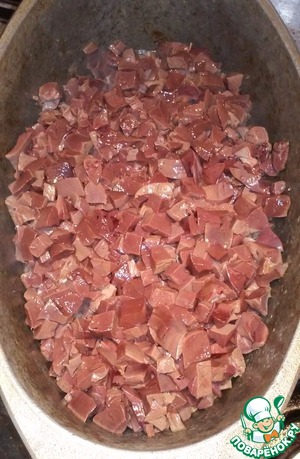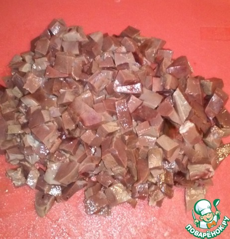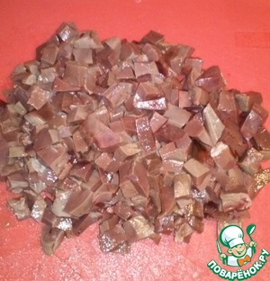Минут через 5-7, вынимаем печенку из воды, даем ей полежать минут 5 и начинаем нарезать небольшими кубиками.