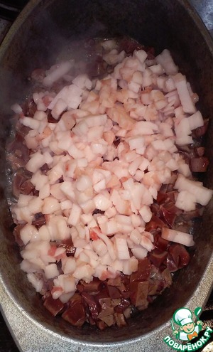 Следом добавляем нарезанный курдючный жир.