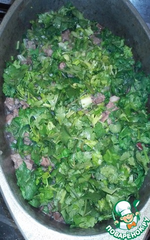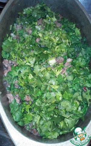 Моем, просушиваем и нарезаем кинзу. Перемешиваем еще раз содержимое нашей кастрюли и добавляем туда кинзу (не перемешиваем).
