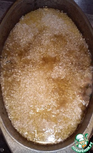 Поверх лука выкладываем промытый рис и разравниваем ложкой.